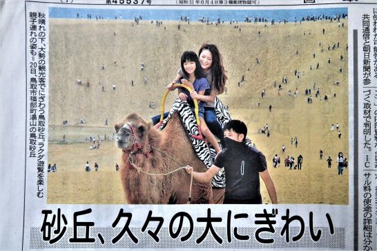 秋晴れの佳き日に恵まれたこの連休。今朝の地元紙「日本海新聞」の1面に写真(1)入りで「砂丘、久々の大にぎわい」という見出し。記事よれば来客数は昨年9月の連休中の2倍とのこと。鳥取の感染者が少ないことに加え「砂丘が広々として感染の心配がない」ということらしい。土産物店の社長は「駐車場が満車になった姿を見て感動で震えた」とのこと。駱駝の顔も何やら満足&自慢気。たくさんの人が登っている砂丘の向こうの青い色は日本海。このまま感染が治まって普通の日常が戻ることを切に祈る。