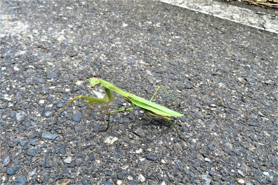 カマキリ君、もう一匹、駐車場で見つけて、これも草むらに戻してやろうと手を伸ばしたらサッと車の下に入ったので「幸運を祈る!」と放置しました。