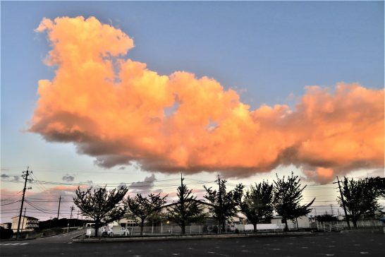 夕刻散歩で総合公園の周囲を一周して駐車場に戻ってきたら東側にビックリするほど低い(低く感じた)所に雲のカタマリ。西陽を受けてオレンジ色に輝いていた(写真1)。〔本日の仕事と歩数〕大山滝句座会報作製PCインプット。5,583歩。