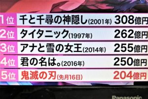 夕刻の民放ニュースを観ていたら「鬼滅の刃」の人気が凄くて、観客動員数も5位になったと言っていた。その画面(写真3)の3位までは観たが、4位の「君の名は。」は観ていない。「鬼滅の刃」は倉吉で上映されているが、なかなか観に行く暇がない。