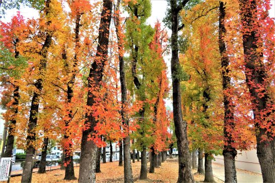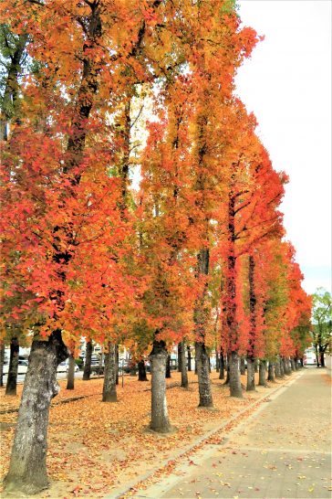 きれいでしょう。この総合グランド(総合公園?)は広くて木の種類も多いようで(私は知らないのですが…)、あちこちの紅葉が見事です。駐車場はゲートがあって有料ですが1時間100円。もちろん人間は無料で、散策している親子連れやカップルと擦れ違いました。広々としているのにマスクをしている人が多いのはサスガでした。
