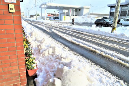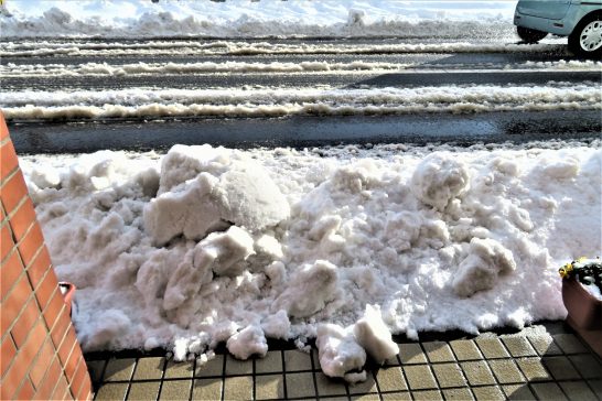 今朝、6時頃から「ガーガー」と除雪車の音。トイレに起きたついでに窓から見たら、向かいのマーケットの駐車場に大型の除雪車が2台。煌々とライトを点けて作業していた。いつものようにゆっくり起きてゆっくり朝食を頂戴して、玄関(店)の戸を開けたら除雪車が掻いた雪のカタマリがドカッ!(写真1、2)。長靴を履いて、久しぶりのスコップで、取り敢えず人が通れる幅、50センチ程を除去。プランターの前の方はお日さまが溶かしてくれるのを待つ作戦。