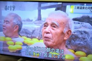 重忠さん、毎年「冬至」には三朝の露天風呂にテレビ局が取材に来るのをご存知で、そのタイミングに合わせて出かけられます。もう何度もローカルニュースで見ていますが、いつぞやは全国ニュースでも流れていました。