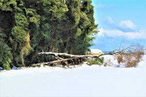 本日、久しぶりに快晴。昼前散歩では今年初めてパワースポット「東伯第3跨道橋」へ。写真1は跨道橋から西(米子方面)。2は東(鳥取方面)。帰路、いつもの散歩道の横を通ったら「通行止め」のバリケードあり。見ると倒木が邪魔をしていた(写真3)。 〔仕事と歩数〕大山滝句座互選資料作成。誌上大会作句。4,796歩。