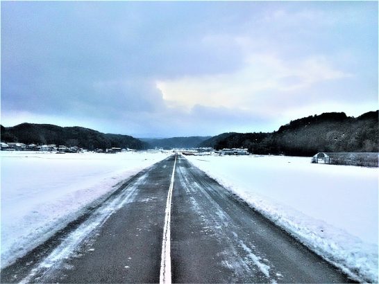 今日は岩美川柳会例会日で鳥取市の東の岩美町へ来ています。残雪は琴浦町と同じぐらで、田圃にはいっぱいあります。