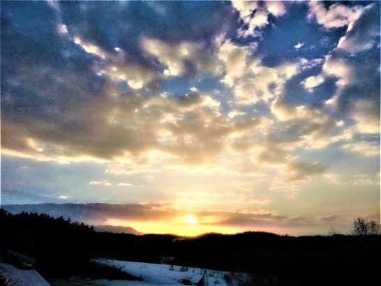 写真1、医光寺からの帰途。上郷谷を振り返ってパチリ。道の両サイドには雪がどっさり。路面はところどころ凍てついていた。2 夕刻散歩にて、午後4時50分の夕映え。 〔仕事と歩数〕「葦群抄」鑑賞。5494歩。