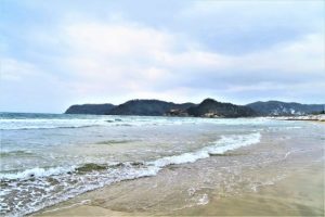 砂浜に雪が残っていたので、長靴に履き替えて波打ち際まで行ったので、臨場感があるようですね。