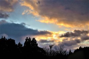 終了後、片付けのあと夕刻散歩で総合公園へ。アラレがバラバラ降ったり止んだりの不安定な天候。灰色の雲に覆われていたが、少しだけ青空が見えたのでパチリ(写真1)。 また、夕映えの綺麗な時間帯(今は5時前ごろ)になっても西空が雲に覆われているので諦めて、駐車場まで戻って振り返ったら雲の切れ間から鮮やかな夕映え(写真2)。 〔仕事と歩数〕大山滝句座段取り&本番。6,152歩(句座の会場うろうろと夕刻散歩)。