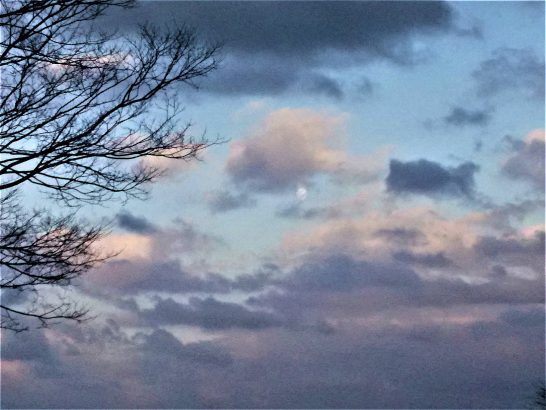 本日、終日曇天。昼前散歩では寒くなかったが、夕方は冷たい風が強くなって早々に退散。西空は雲が多くて夕映えは見えず。東の空に少し青空と真ん中辺にお月さま(写真1)。〔仕事と歩数〕塔社常任理事向け連絡資料作成。4,754歩。