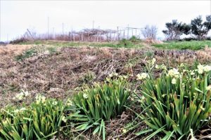 帰路、まだ4時になっていないのに遠くの山が霞んで見通しが悪い。黄砂の所為だろう。どの程度か確認しょうとパワースポットの東伯第3跨道橋まで散歩してパチリ(写真1)このあたりはそれほど霞んでいないようだった。近くの土手ではスイセンが咲いていた(2)。〔仕事と歩数〕鹿野川柳会向け作句。5,849歩。