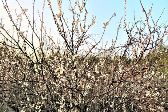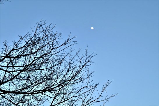 写真1、夕刻散歩にて。ふと気がつくと畑の中で梅が満開だった。2、枝先に半分のお月さま。〔仕事と歩数〕塔社向け「愛染帖」「飛行船」など再チェック後メール&発送。毎日新聞「とっとり柳壇」選評。5,090歩。