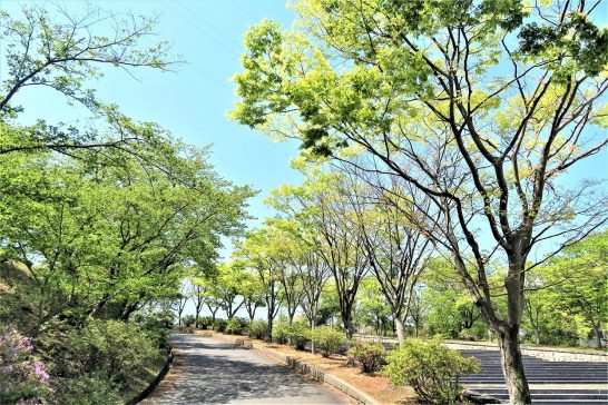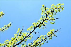 本日も快晴で暖かで、机の前に座っているのは勿体ないような陽気だった。昼前散歩の総合公園遊歩道の若葉も鮮やか(1)。公孫樹の葉っぱも元気よく広がっていた(2)。