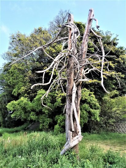 昨日の総事で2班の溝掃除が終わったあと大元神社へ回ったが、いつもと違う道で神社の南側参道へ。その参道入り口の右側に立っていたのが写真のもの。芸術家が創り上げたオブジェのようだが、中心は樹木でその周りは太い蔓。両方とも枯れていて色合いから見るとかなり前からあるようだが、普段は通らない道なのでまったく気がつかなかった。