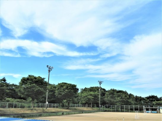 本日、午前中は梅雨の晴れ間で快晴。昼前散歩に出たとき、10分ほど遠回りしてドライブ。窓を開けて快適。写真は夕刻散歩でのテニスコート上空。少し☁が出てきた。 〔仕事と歩数〕誌上句会向け作句ほか。4,348歩。