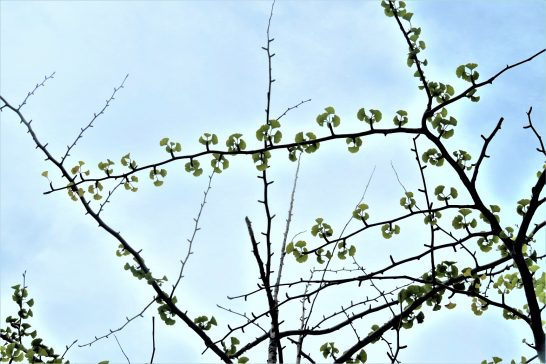 夕刻散歩で総合公園の遊歩道をぶらぶらしていたとき、痩せ細った公孫樹を見つけた。他の公孫樹はいっぱい葉を茂らせて、早いものでは実を付けているのもあるが、この痩せた樹は葉を付けていない枝も多く。付けていても写真のように小さな葉ばかり。春先に他の樹の芽吹きを撮ったときのと同じようなか細い葉。さて、これで厳しい夏や冬に耐えてどこまで生きて行けるのだろうか?