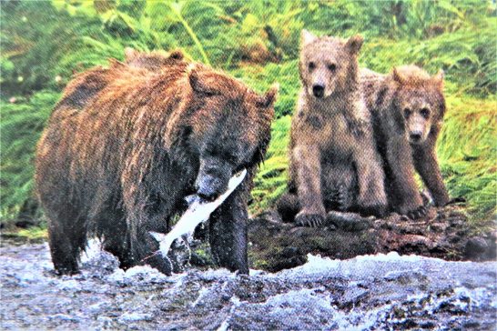 【アラスカ州カトマイ国立公園付近では、いくつもの川が海に流れ込んでいます。夏になるとアラスカヒグマたちがその河口を目指します。川を遡上する鮭を求めて。鮭がたくさん来る川は大きなオスたちが占領しています。その年に生まれた子グマを連れた母グマは、オスの近くに行くことが子グマにとって危険なことを知っています。母グマはオスがいない河口を目指します。徘徊するオスたちの動きを、河口に近づく前から慎重に見極めます。雨の朝、若いオスがまだ潮のみちていない浅瀬に入って、遡上前の鮭を追いかけています。迫力はあるのですが、泳ぐ鮭を捕まえるのは至難の業。潮が満ちてくると母子がやってきました。必死で鮭を追う若いクマを見た子グマは驚き、恐怖、そして好奇心を抱いて母親の背にしがみつきます。河口の鮭に母グマが狙いを定めて飛び込むと、次の瞬間、口に鮭を咥えていました。ベテランのお母さんから鮭をもらうと、子グマたちは嬉々として食べました】
