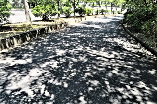 本日、少し雲が多くて熱射が和らげられたよう。いつも昼前散歩では首筋が熱くなっていたが、今日はそれがなかった。だが総合公園の遊歩道にはバッチリ木陰の模様ができていた(写真上)〔仕事と歩数〕センマガ「名句鑑賞」。5,063歩。