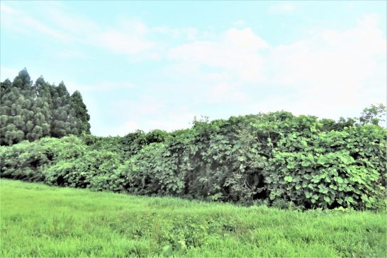 写真1は、句会からの帰途、鹿野街道横のヒマワリ畑。左の山は鷲峯山の端っこ。 2は、夕刻散歩で久しぶりに通りがかった農道横の柿の木を覆っている葛。10本ぐらいの柿の木があるはずだが、すべてすっぽり葛の蔓に覆われている。隙間から覗いたら青い実が見えた。〔仕事と歩数〕鹿野川柳会出席。川柳展望「会員作品評」。4,225歩。
