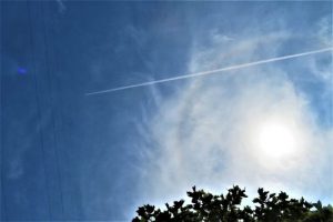 写真1、昨日は鹿野街道のヒマワリを撮ったが、これは総合公園へ行く途中にあるヒマワリ畑。(私たちも綺麗でしょう!)と言っていた。ヒマワリの後ろの背の高いのは飼料用のトウモロコシ。2、昼前散歩で見た飛行機雲。太陽の周りの虹(ハロ)を突っ切って行った。3、木の葉から落ちて来たのか?飛んで来たのか? 飛行機雲を撮っていた左手にカマキリの赤ん坊。草むら近くに降ろしてパチリ。全長4センチほど。カメラを構えると伝統的ファイティングポーズ!〔仕事と歩数〕川柳展望「会員作品評」。5,123歩。
