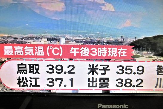 今日も暑かった。ニュースによれば鳥取市は最高気温39、2℃!(写真3)で、これは観測史上初めての記録とのこと。我が琴浦町は鳥取市から60キロ。米子市から40キロなので、米子の気温の方が近い。従って最高気温は37℃ぐらいではなかったか。いずれにしても体温を超えていたようだ。このような猛暑でも、デスクワークにはエアコン入れず。2メートル離した扇風機を中にして首を振ってもらってまずまず快適。眠たくなったら、顔を洗って、シャツに水をかけたらシャンとした(シャンとしても、半ボケではあるが・・・(-_-;)。写真1,昼前散歩での夏雲。〔仕事と歩数〕橿原市民川柳誌上大会、選考。5,367歩。
