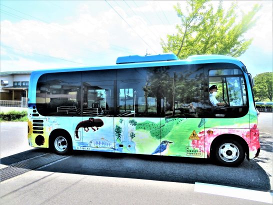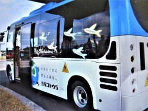 今年の春ごろから?横っ腹に賑やかな絵が描いてあるラッピングバスを見かけるようになった。ブログにアップしようと思っていたが、なかなかシャッターチャンスがなかった。ところが、今日の昼前散歩のとき、ちょうどバスが総合公園の停留所に入ろうとしているのに出会った。私が写真を撮ろうと横断歩道の手前で立ち止まったら、運転手さんがバスを止めて(先に渡れ)と手で合図。私は(バスの写真を撮りたい)と、カメラと手振りで合図。すると運転手さんは私の真ん前でバスを止めてくれたのでパチリ。(ありがとう!)と手を振ると、運転手さんも手を振ってバイバイ。無言の遣り取りの中で撮れたのが1(クリックで大きくなります)。この車体の反対側を撮り損ねたので先ほどネットから探したのが2。惑星コトウラの上には「小さいくせに ぜんぶある」と書いてある。う~ん、無いものもいっぱいあるけどね~(-_-;)。このバスは町内の循環路線バスだが、他にスクールバス4台にも子どもたちの愉快な絵が描いてある。矢印右クリックで写真が出てきます。⇒ 小学生デザインバスお披露目会を開催しました | 鳥取県琴浦町