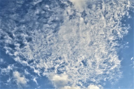 本日の最高気温予報は27℃だったが朝方は涼しくて半袖では寒いぐらいだったので長袖を出して着込んだ。ただ昼前になると暖かくなってきたので昼前散歩は半袖に着替えて出かけた。昼過ぎまで曇天だったが、夕刻には青空が広がってきた。写真は夕刻散歩での縮緬のような雲。〔仕事と歩数〕山陽カルチャー資料作成&予習。5,655歩