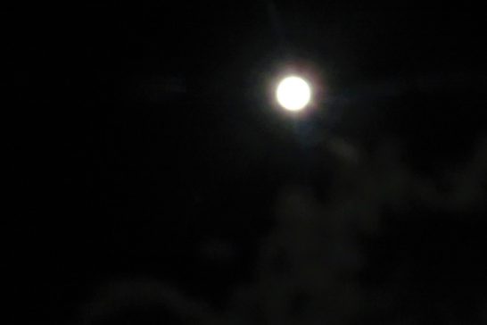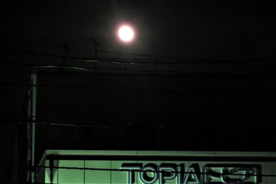 (午後8時15分追記)下の写真は、本日午後8時に撮った1日遅れの満月。拙宅向かいのトピアの上空に現れたのを自室の窓からパチリ。