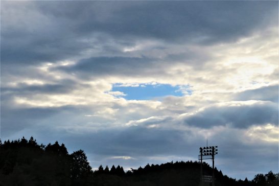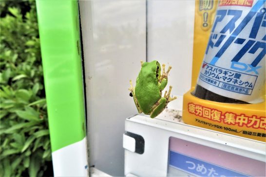 本日、昨日に続いて曇天ときどき小雨パラパラ。夕刻散歩のときにようやく青空が、まるでUFOが降りて来るように丸くぽっかり開いていた(写真1)。総合公園の自販機で私が買うのは大概「アスパラドリンク」だが、先ほどはアオガエルが「ボクも飲みたい!」とへばりついていた(2)。〔仕事と歩数〕センマガ「文学賞」選考。5,520歩。