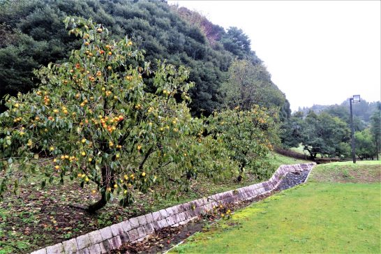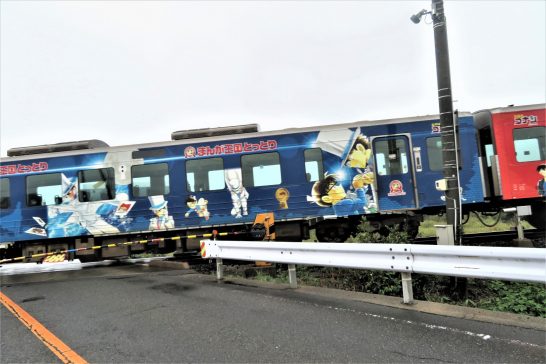 ・本日、朝から小雨で気温も平年並みぐらい? 半袖では肌寒くて長袖に衣替え。昼前散歩も傘をさして風の吹かないところを選ってぶらぶら。写真1は、総合公園の柿。渋柿だがいい色になってきた。2は、踏切で待っていたら名探偵コナンのラッピングカーだったので慌ててパチリ。カメラが傾いて登山電車のように斜めになってしまった。 〔仕事と歩数〕愛媛県川柳大会投句向け作句。4,024歩。