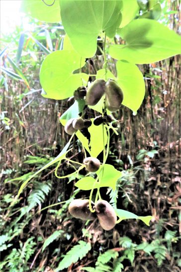 ・夕刻には雨が上がったのでほとんど人の通らない山道を散歩(写真1)。ぶらぶらしていたらいきなり大きなムカゴがぶら下がっていたのでビックリ(2)。その周辺でもいっぱいぶら下がっていたのでゲット。大きいのは湯掻いてバター炒めしてこれから焼酎のアテに。〔仕事と歩数〕大山滝句座・互選原稿作成&句箋段取りほか。5,229歩。