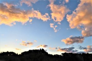 ピンクの夕焼け雲 いいですね。茜色もいいですが、この雲のもつほんわかした感じが
