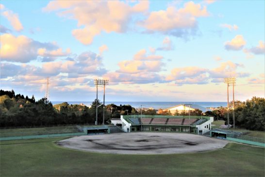 はい、海が見えるのはいいですね。散歩道で日本海がいちばんクッキリ見えるのは、この写真1の場所。野球場外野の上にある遊歩道です。