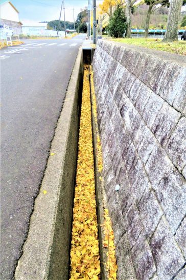 ・写真は昼前散歩にて。この2日ほど、強風でクルクル舞っていた落葉の終着駅は深い溝。ちょっと見たところ小判がザックザク! 昨日の寒さは少しだけ緩んだが、暖かいというほどではなかった。夕刻散歩では暗くなって冷たい雨が降ってきたので戦意喪失して帰宅。〔仕事と歩数〕11月末締切の誌上大会向け作句。大山滝会報作成。3,310歩。
