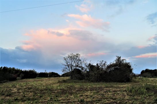 ・本日、昼前散歩までは晴れていたが午後からときどき小雨。夕刻散歩ではまた薄日が差していた。写真は午後4時45分。夕焼け雲は西側の空ではなく北側(日本海の上)の雲。〔仕事と歩数〕瓦版「咲くやこの花賞」選考。5,284歩。