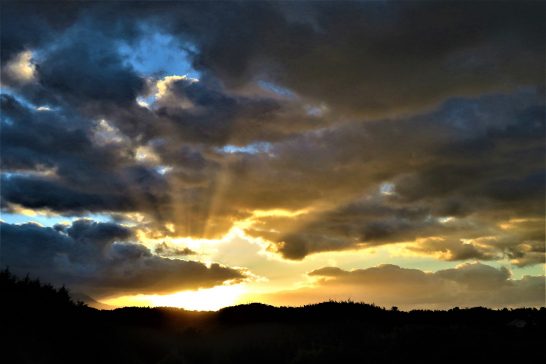 夕焼け、サーチライトのようでしょう。この写真を撮った5分後に太陽が顔を出して、眩しくなりました。