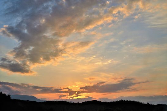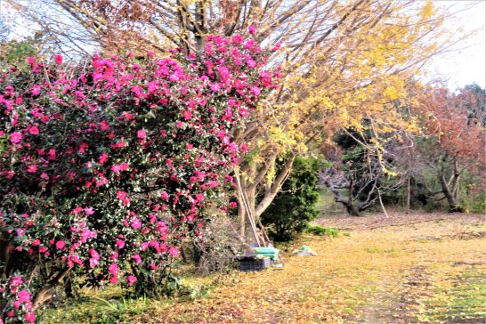 ・本日も昨日と同じように、小春日和の穏やかさで散歩でも手袋不要だった。写真1は、倉吉から帰宅してからの夕刻散歩にて。いつも歩く農道から少し離れた農道脇の畑で夕陽を受けて輝いていた山茶花のピンクと公孫樹の黄色。 2は、そのあと午後4時40分頃の夕映え。〔仕事と歩数〕川柳塔社「せんりゅう飛行船」。6,271歩。