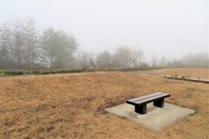 写真1、蒜山高原初冬の景色。2、3、岡山県総合グランドの名残りの紅葉。 写真下、帰路、霧に包まれた高梁SAの「考えるベンチ」。「週末は雪になるようですね。くれぐれもお大事に!」と言っていた。〔仕事と歩数〕山陽カルチャー。3,161歩。