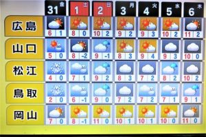 ・写真1、本日のパワースポット(東伯第三跨道橋)から米子方面を見る。24日に来たので今年はもういいだろうと思っていたが、雪を被った状況を撮りたかったので。南向きの斜面(右側)のはほとんど溶けていた。2、3、テレビニュースの天気予報の画像。どれを見ても明日は吹雪のよう。〔仕事と歩数〕毎日新聞山陰柳壇選評。4,090歩。