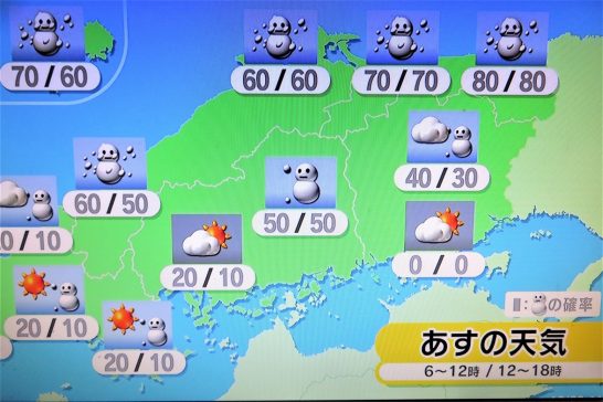・写真1、本日のパワースポット(東伯第三跨道橋)から米子方面を見る。24日に来たので今年はもういいだろうと思っていたが、雪を被った状況を撮りたかったので。南向きの斜面(右側)のはほとんど溶けていた。2、3、テレビニュースの天気予報の画像。どれを見ても明日は吹雪のよう。〔仕事と歩数〕毎日新聞山陰柳壇選評。4,090歩。