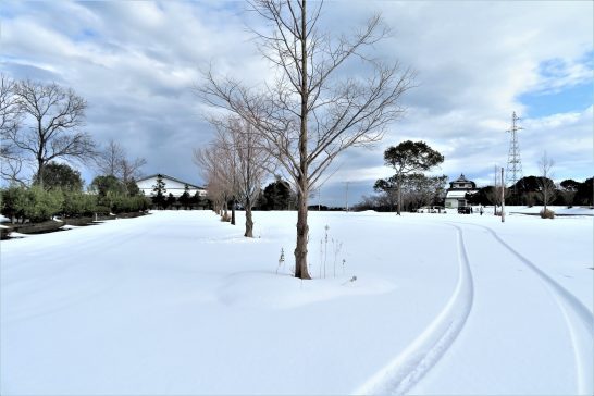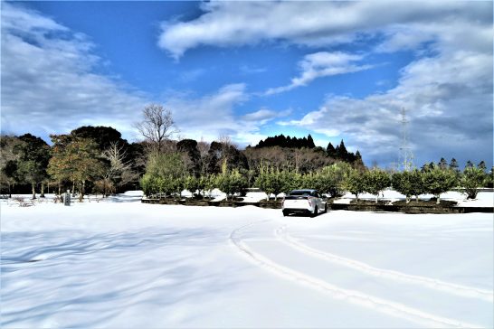 ・雪は止んだが、総合公園の遊歩道にはまだたっぷり残っている。マーケットやホームセンターなども大都会のように巨大ではないので、買い物もせずウロウロも連日ではちょっと…。という訳で、本日は総合公園の駐車場周辺を長靴を履いてよたよた散歩始め。写真1、2、マイカーのシュプール。四駆で冬用タイヤなのでこの程度の雪なら楽勝。