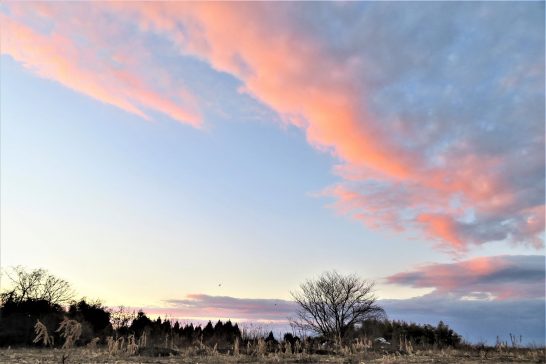・写真1、倉吉への往路。小鴨川河原の残雪。正面の遥か先、冠雪の山は大山。2、夕刻5時の散歩の農道にて夕焼け雲。〔仕事と歩数〕打吹川柳会向け作句&出席。4,375歩。