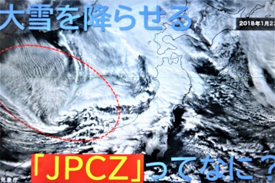 【 冬の日本海では、暖流である対馬海流などの影響で比較的暖かい海水の上を、寒気団の冷たい風が通り抜けることで、背の低い雪雲ができる。ふつう、雲の高さは2,000mから3,000mくらいである。また、気象衛星の雲画像でも分かるように、雪雲は筋状に何十本も平行に並ぶ(筋状収束雲)。しかし時に、この筋が平行ではなく、一定のラインで衝突することがある。これが日本海寒帯気団収束帯(JPCZ)である。