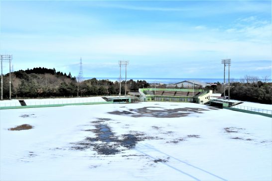 ・写真1、2。昼前散歩の総合公園の残雪状況。野球場のグランドは溶けかかっていたが、左右の応援席はまだたっぷりあった。遥かな水平線は日本海。〔仕事と歩数〕明日の「大山滝句座」に向けて、句箋や互選原稿作成などの準備ほか。5,163歩。