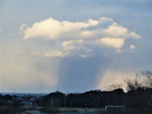 ・写真2、夕刻散歩にて、遥か海上の雲から薄黒い帯が海と繋がっていた。ここだけ雨でも降っているのだろうか。〔仕事と歩数〕愛染帖選考後PCインプット。4,885歩