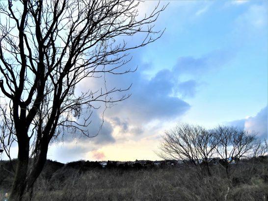 ・本日、午前中は冷たい雨ということもあって散歩は少しだけ。午後からはようやく青空が広がってきた。写真は夕刻散歩にて。〔仕事と歩数〕誌上大会向け作句&塔社向け「せんりゅう飛行船」。5,307歩。