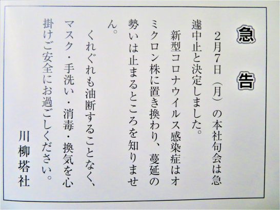 ・上記の塔社サイトトップでもお報せしていますがオミクロン株による感染拡大のため、2月7日に予定していました【川柳塔本社2月句会】は中止致します。ご出席予定の皆様には申し訳ございませんがご容赦下さい。(写真3、川柳塔2月号表紙裏のお報せ)