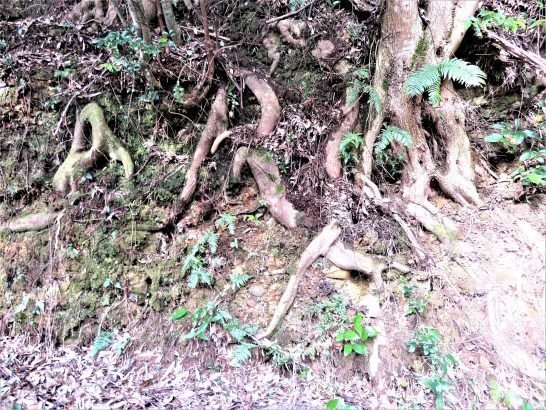 ・樹木が強風にも負けずに屹立しているのはガッチリ大地に喰い込んでいる根っ子のおかげ。ということは説明するまでもないが、その有り様を見る機会はあまりない。本日も冷たい風を避けて「切り通し」を歩いたが、あちこちにギリギリまで土を削られて露出している根っ子があった(写真1)。人間の都合で命の綱である土を削られて、さぞかし不本意であろうが、苦情を言うこともなくガッチリ大地に喰い込んで頑張っていた。