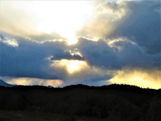 ・写真2は、夕刻散歩での雲間から見えた夕映え。本日は立春だが、冬至の頃と比べるとずいぶん日が長くなった。〔仕事と歩数〕「川柳展望」会員作品評。5,259歩。