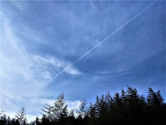 ・写真は夕刻散歩にて。ふと見上げたら見事な飛行機雲だった。〔仕事と歩数〕誌上大会向け作句ほか。6,056歩。