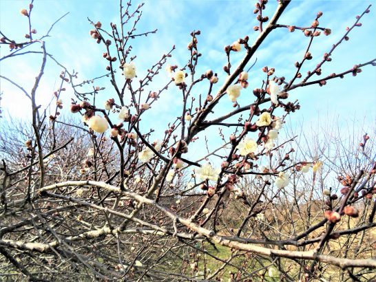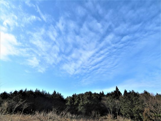・写真1、2、仕事のキリがついたので、午後3時頃から散歩。総合公園外周の農道上空の面白い雲。その下では梅が咲き始めていた。〔仕事と歩数〕大山滝句座互選原稿作成ほか。6,244歩。